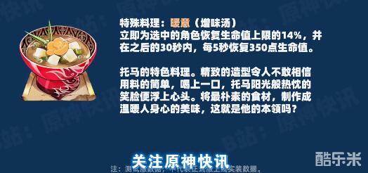 原神托马特殊料理是啥?原神托马特殊料理暖意配方是啥?托马特殊料理效果是什么?游戏中一些玩家呢都听说2.2版本的时候会出这个托马的呢,那么对应的也有这个特殊料理的,这次的食物就是这个暖意了,要想做的话是需要知道下配方的,那么下面就一起来看看吧!