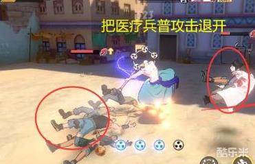 在输出完一套之后,肯定无法秒掉的,所以我们再找寻医疗兵的位置,普攻将他击退拉开小兵位置,接着再进行集中输出。