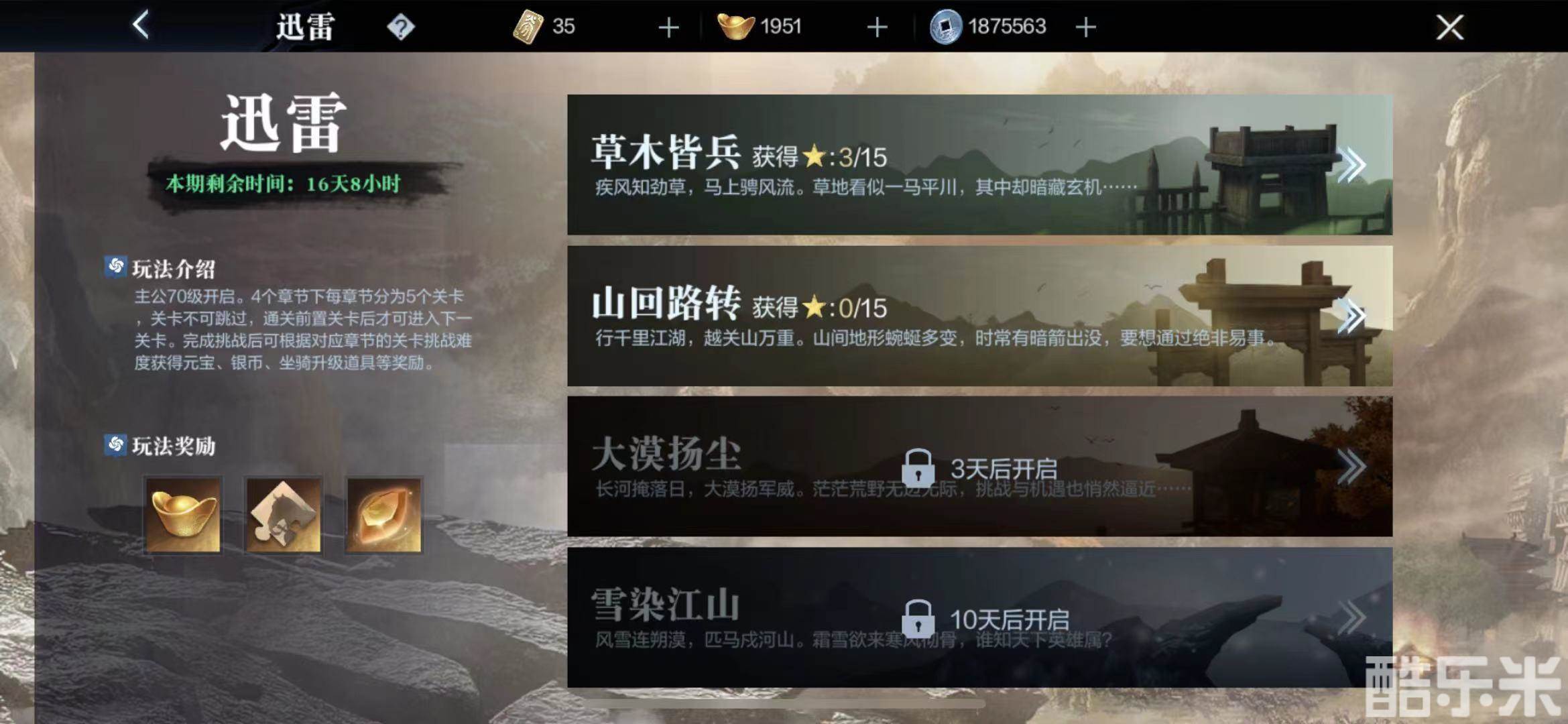 在迅雷玩法中,玩家可以与战马一起上阵破敌,获得丰厚的奖励。该玩法开启后,每四周为一个赛季,且每周开放一个章节,每个章节下有5个关卡。目前共有四大地图:草木皆兵、山回路中、大漠扬尘以及雪染江山,可供玩家进行挑战。