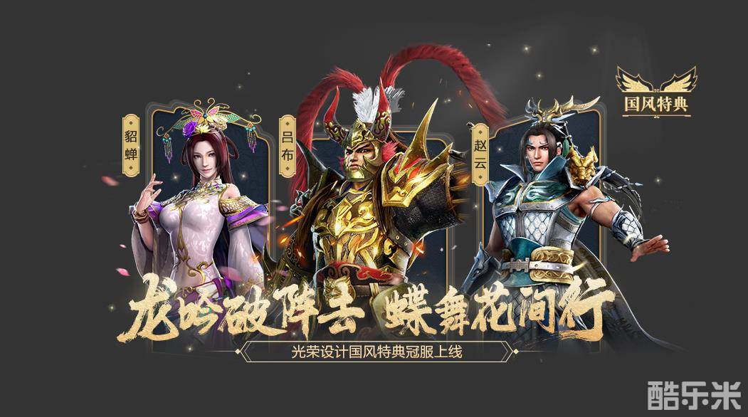 龙吟破阵击,蝶舞花间行,目前游戏中最受欢迎的三大武将,当属百胜将军常山白龙赵云,武艺彪悍的鬼神猛将吕布,以及有着闭月羞花之美色的舞姬貂蝉,本次更新还将上新三位人气武将的全新【国风特典】系列冠服,分别为赵云-水龙吟、吕布-破阵子、貂蝉-蝶恋花。