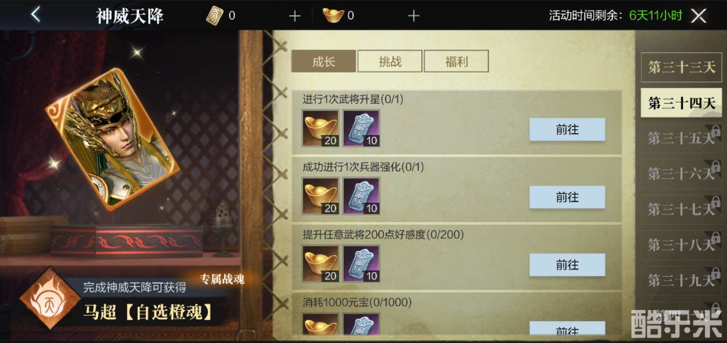 在获取碎片顺利兑换武将后,提升培养自然也是重要的一环,常驻福利挑战任务八日军务,也将随本次更新开启新的一期——神威天降系列任务,玩家可以通过这次八日军务,获取强力武将马超的自选橙色战魂。