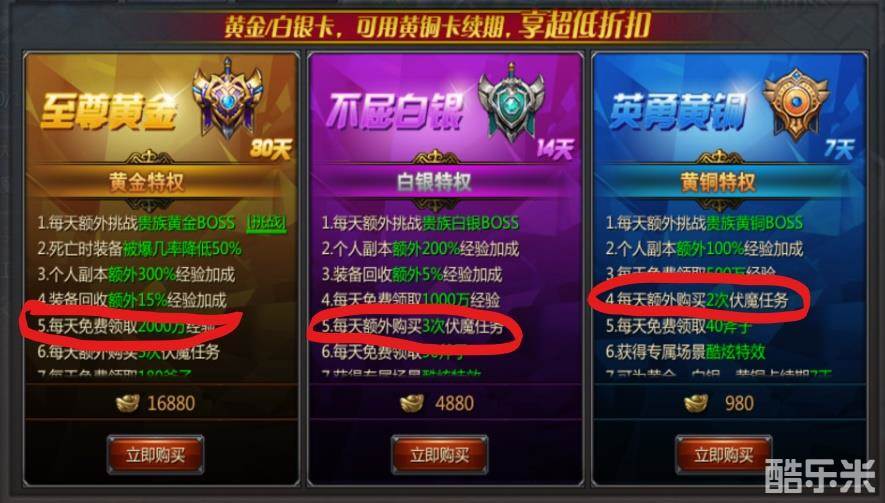 比如至尊黄金卡,能够每天额外地购买到五次伏魔任务。五次,每次若是满星的话可以多获得5万声望。