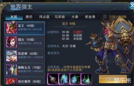 每个国家都有属于自己的世界boss,从40级开始,每10级会定时刷新一个世界BOSS。