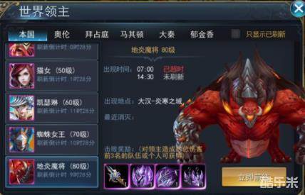 最早的世界boss是80级的地炎魔将,第一次刷新时间是早7:00,之后分别是8:00的70级蜘蛛女王、9:00的60级凯瑟琳、10:00的40级蛮王,11:00时的50级猫女,除蛮王和猫女在晚22、23时各刷新一次外,其余下午都会刷新一次。