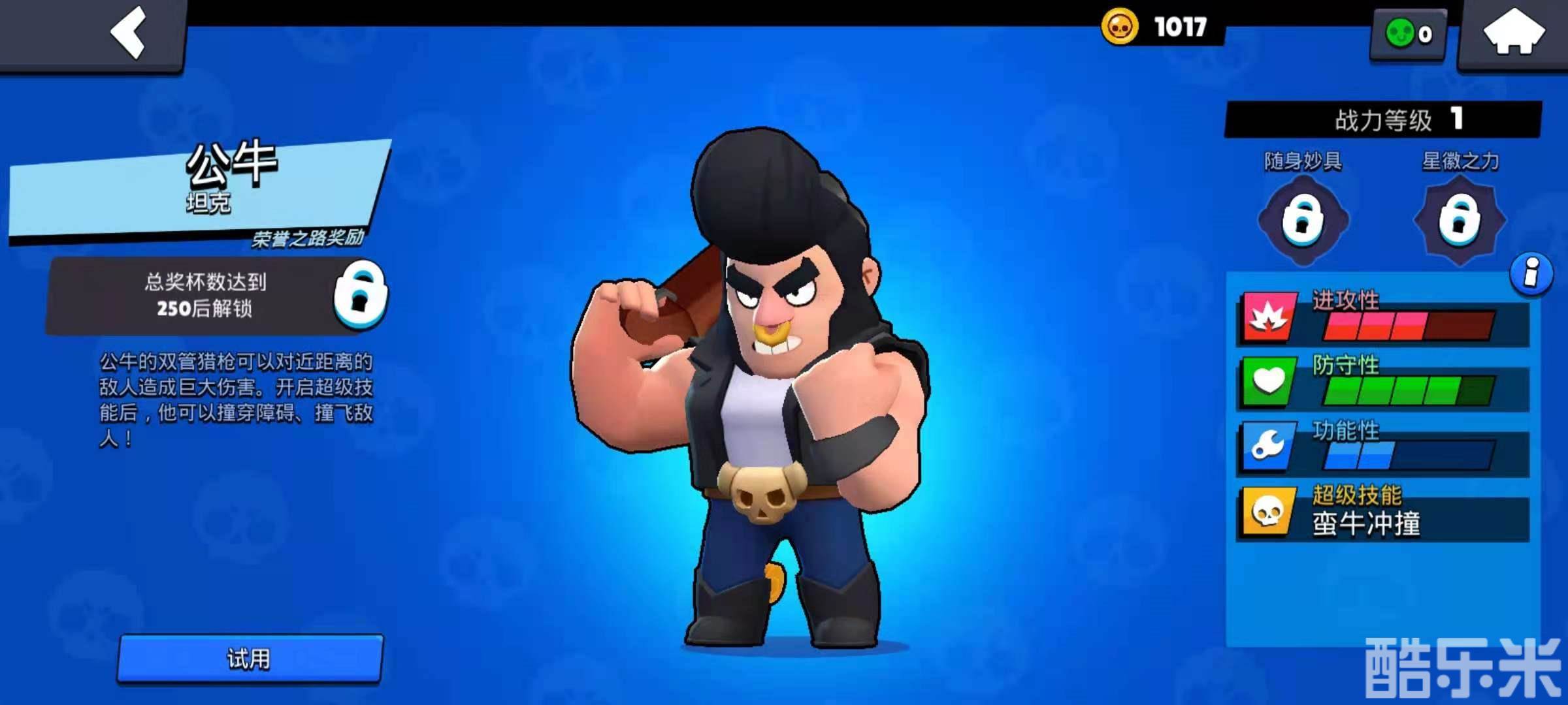众多肉盾英雄中,最适合新手的有公牛,雅琪,弗兰肯这三个,其中公牛是新手第一个接触的英雄,面板属性中进攻性为三颗星,防御性为4颗星,功能性是2颗星。普通技能双管猎枪,效果是在近距离造成大量伤害,这个技能伤害高,但是距离很近,一般就是贴脸释放。超级技能是蛮牛冲撞,效果是公牛发动冲锋,可以撞飞路径上的敌人,还可以撞穿掩体,这一点就很厉害了,敌人想要通过掩体来打游击得到目的就无法达到了。