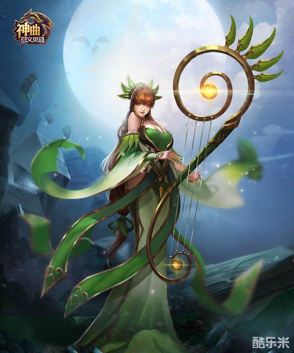 从曝光的原画我们可以看到,美乐蒂似乎是一个钟爱绿色基调的女神,她身穿极具精灵风格的绿色晚礼服,一头棕色如瀑的长发随意垂落,头顶带着翡翠树叶状的装饰物,手中漂浮着一把造型独特的四弦琴。美乐蒂女神看起来温柔甜美,但相信她在《神曲之符文英雄》一定会带给玩家惊喜。