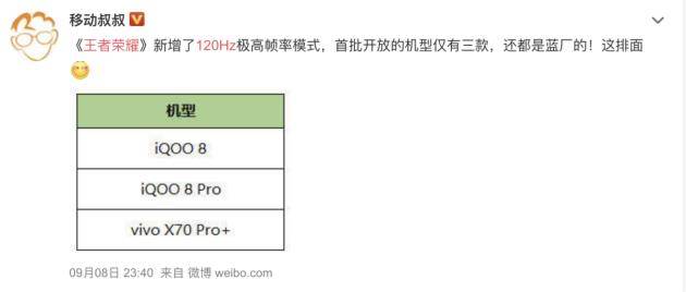 《王者荣耀》此次升级120Hz极高帧率,将为用户带来“质”的游戏体验改变,游戏操控体验将更加跟手、丝滑,游戏画面将更具冲击力,同时也对手机的硬件配置提出了更高的要求。极高帧率模式首发机型被vivo包揽,获得了众多数码大V的关注,众多大V纷纷表示“蓝厂这排面给足了。”而众多游戏玩家则表示“手机该换了。”