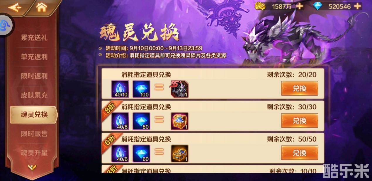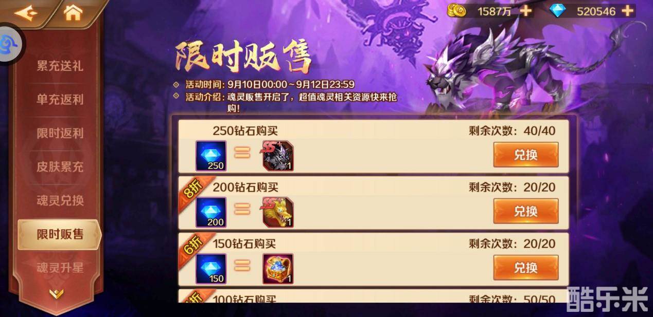 魂师大人们可以通过钻石兑换一定数量的SS+魂灵暗魔邪神虎碎片,此外,其他珍贵资源也会出现在限时贩售中,既然是限时,错过了就没有了哦~还不赶快行动起来!