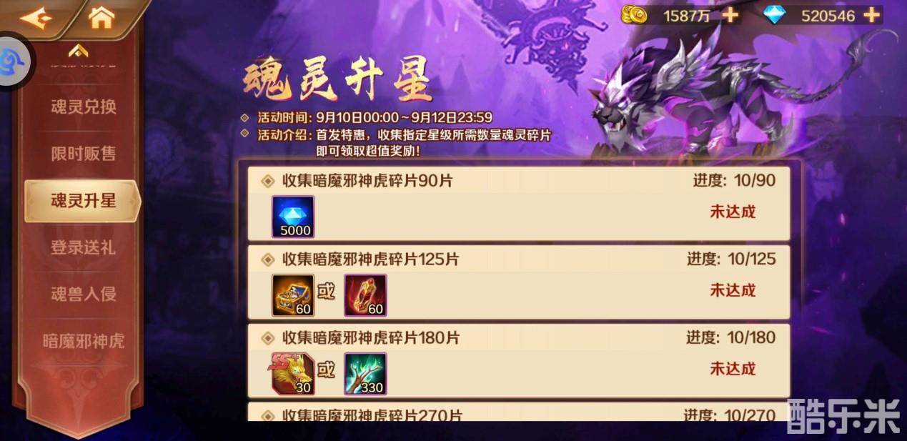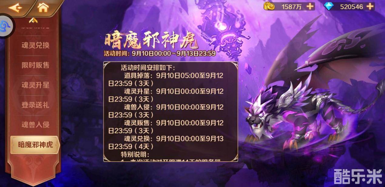 温馨提示:活动期间攻打副本胜利以及斗魂场战斗即有概率掉落活动道具“魂灵晶石”,此外还能通过完成魂兽入侵任务获得“魂灵晶石”,集齐一定数量后,即可兑换SS+魂灵暗魔邪神虎碎片和各种稀有资源哟!