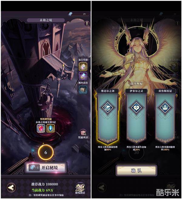 选择好挑战层,然后在右侧栏就会显示本关卡可能获得奖励,在进入挑战之前,也会有三选一的女神祝福,一般我就选择增加伤害的,尽量能在30s内rush掉,可以领取史诗的奖励。