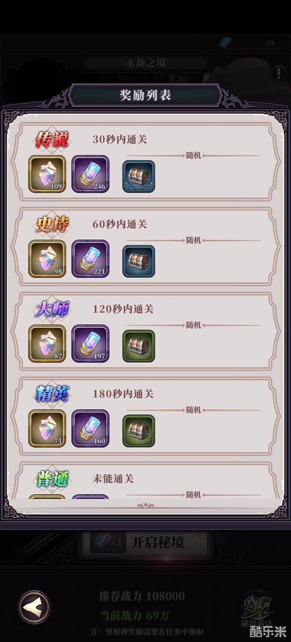 当然你的阵容越厉害,通过时间越短奖励越丰富,这边会有等级设定,主要分为:普通-精英-大师-史诗-传说。具体奖励如下: