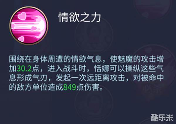 情欲之力:围绕在身体周遭的情欲气息,使魅魔的攻击增加52.2点,进入战斗时,恬娜(魅魔)可以操纵这些气息形成气刃,发起一次远距离攻击,对被命中的地方单位造成1191点伤害。(伤害数值与军团等级、进阶和升星成正比关系)