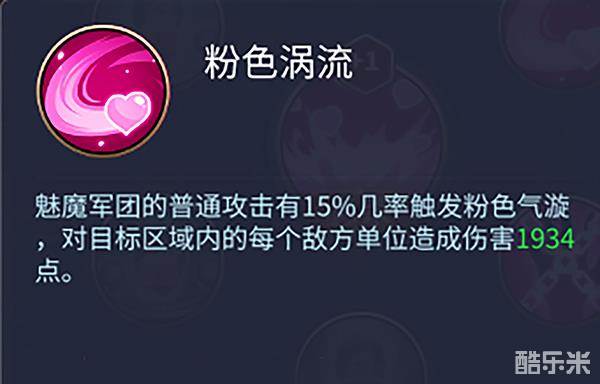 粉色涡流:魅魔军团的普通攻击有15%几率触发粉色气漩,对目标区域内的每个地方单位造成伤害1934点。