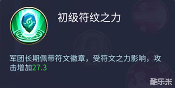 初级符纹之力:军团长期佩戴符文徽章,受符文之力影响,攻击增加27.3