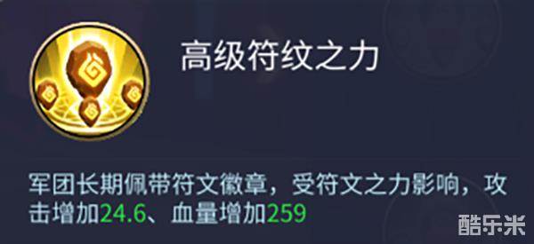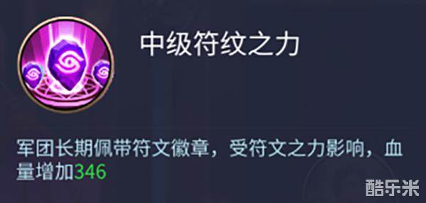 中级符纹之力:军团长期佩戴符文徽章,受符文之力影响,攻击增加24.6、血量增加259