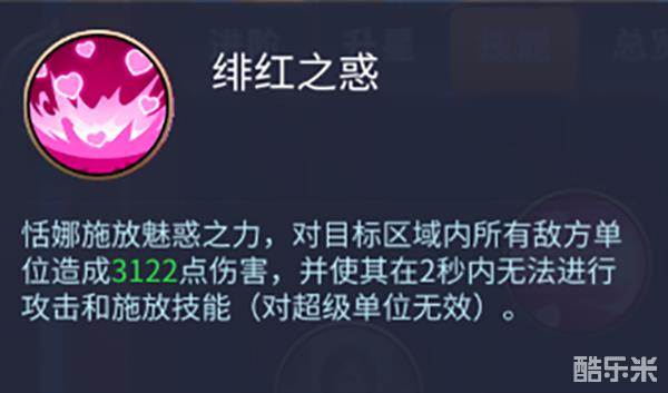 绯红之惑:恬娜释放魅惑之力,对目标区域内所有敌方单位造成3122点伤害,并使其在2秒呢无法进行攻击和释放技能(对超级单位无效)