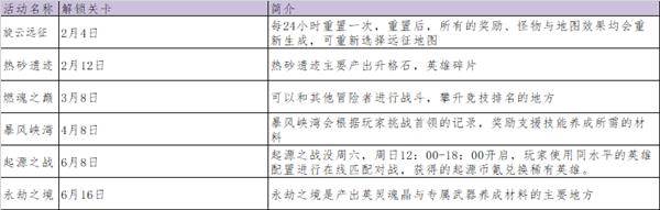 《绯石之心》城外副本这部分一共有6个玩法,分别是旋云远征,热沙遗迹,燃魂之巅,暴风峡湾,起源之战和永劫之境。这个按推图闯关顺序不同进行解锁。以下是解锁关卡与对应副本产出与开启时间。