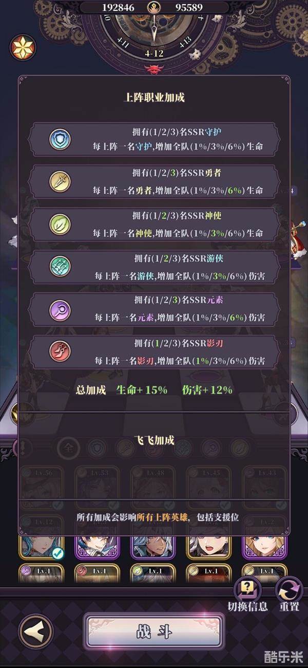 点击战斗页面右上方图标,可以看到根据上阵的职业和数量来决定最终的队伍加成,并在下方显示出来。