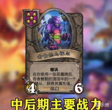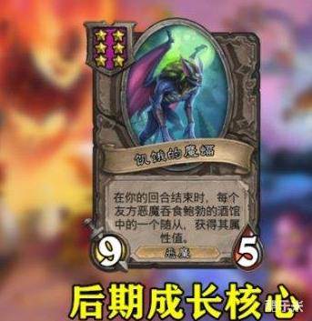 其次是恶魔流最主要的战力“贪食的乌祖尔”,自带嘲讽,并且在使用一张恶魔后,它会吞食鲍勃的酒馆中的一个随从,获得其属性值。它的成长速度比小绿和小粉可高太多了,运气好的话,刚一拿到马上就能成长几十点身材,超级能打。自带嘲讽有利也有弊,优点在于可以轻松一打多,缺点在于太怕剧毒了,后期需要给其它恶魔贴嘲讽来反保一下。