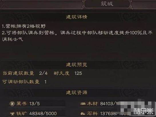第三、满足上面的条件后,就可以随便去个空地“筑城”,然后选择营帐,营帐可以提供2格视野,部队能派到营帐,这个过程移动速度会提升一倍,同时不会消耗士气值,不过建造营帐还得消耗策书,比如一级建造是消耗5个策书。