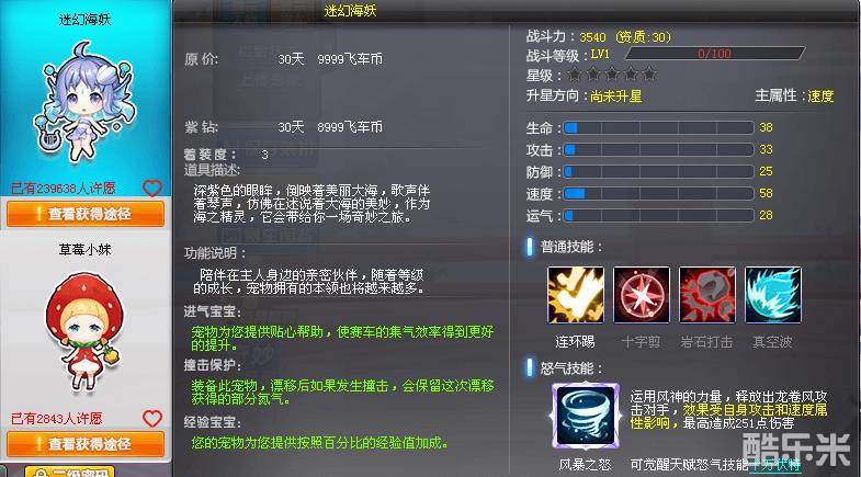 迷幻海妖主属性为30资质的速度宠物,在升星方向上可以采用‘’5速‘’或者‘’3生2速‘’的策略来进行宠物对战。