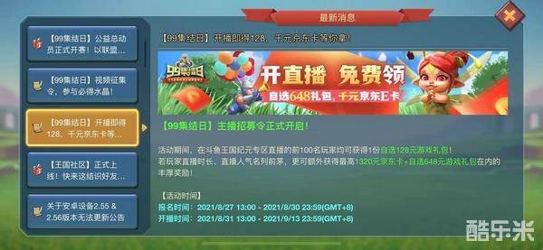 8月27至9月13日,在斗鱼《王国纪元》专区直播的前100名玩家均可获得1份游戏大礼包!直播时长、直播人气名列前茅的游戏玩家们,还能额外获得包括千元京东卡、自选648游戏礼包在内的丰厚奖励!