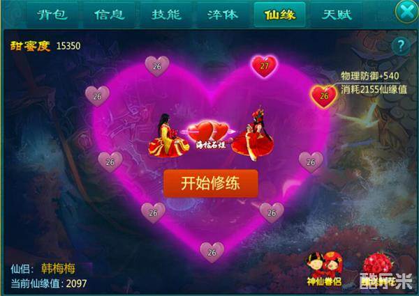 2)仙缘修炼消耗的仙缘值来源:结缘后,双方亲密度即为初始仙缘值,结缘后每增加1点亲密度,双方都能获得1点仙缘值。