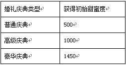 1)双方初始的甜蜜度为庆典结束时的甜蜜度,若不举行庆典,初始的甜蜜度为0,若举行庆典,则在庆典结束后根据庆典类型赠送不同的甜蜜度
