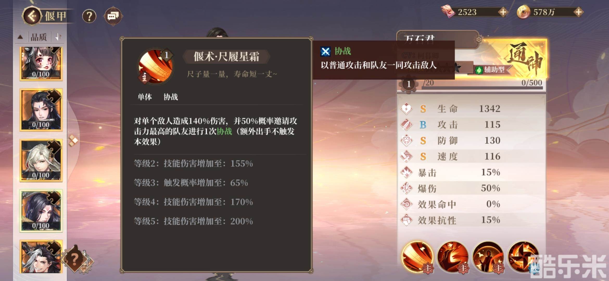 万石君的一技能是带有协战效果,此技能让攻击力并不很强的万石君提升了攻击能力,由于技能没有冷却时间,所以协战的效果非常明显,可以额外提升整个队伍的攻击能力。
