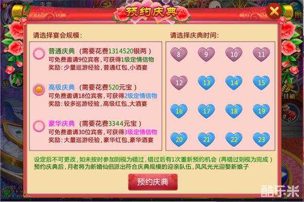 1、不同规模的庆典花费有所不同,所使用的巡游花轿规模、免费邀请宾客数、巡游经验、礼包数量等奖励均不同。