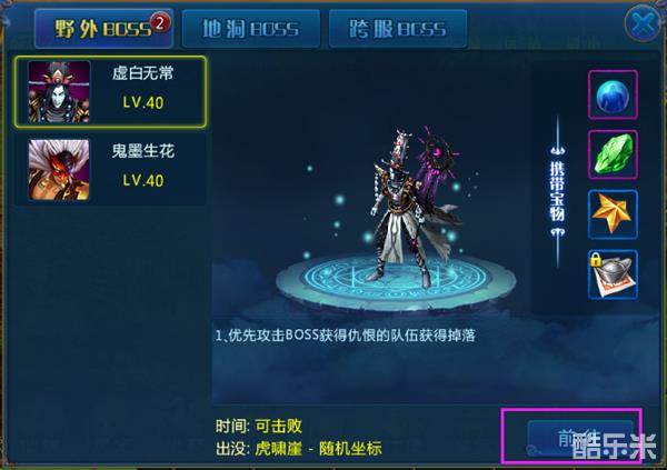野外boss现在有两只,虚白无常会在虎啸崖随机刷出;鬼墨生花在天苍原随机刷出。