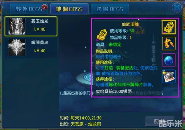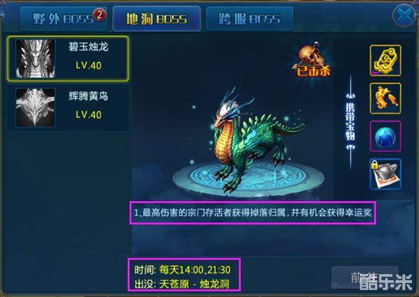 每天的14:00与21:30分,不同的boss会在不同的地洞中刷新,虽然到时间游戏主界面会有图标提示,但是还是建议各宗门的玩家提前去地洞里面守着