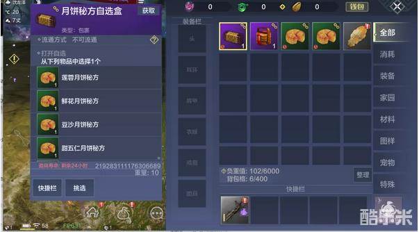 在背包内打开礼盒,月饼配方礼盒里包含莲蓉、鲜花、豆沙、甜五仁、水果这五种甜口味月饼,以及鲜肉、蟹粉、云腿、咸五仁、椒盐这五种咸口味月饼,旅者们可以自由选择要制作哪种口味的月饼。
