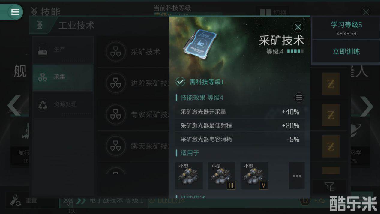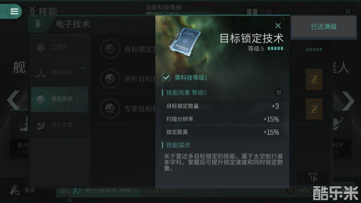 其次是目标锁定技术,这个技能的效果是提高锁定目标的速度以及可以锁定的数量,通过提升该科技可以让大家的挖矿舰船效率变得更高,更难以被敌人拦截导致损失。此外在选择挖矿地点时需要注意考虑路径的安全性,不能单纯考虑往返的时间消耗。