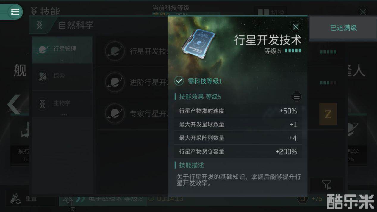 行星开发技术也属于是玩家们推荐直接点满的科技,它的效果是提升挖矿的效率,等于提高产量,并且百分比效果十分可观。行星开采只要玩家选择高安星系就是一个稳定且相对更安全的赚钱手段,其技能等级的提升所带来的收益也会飞跃式的上涨。