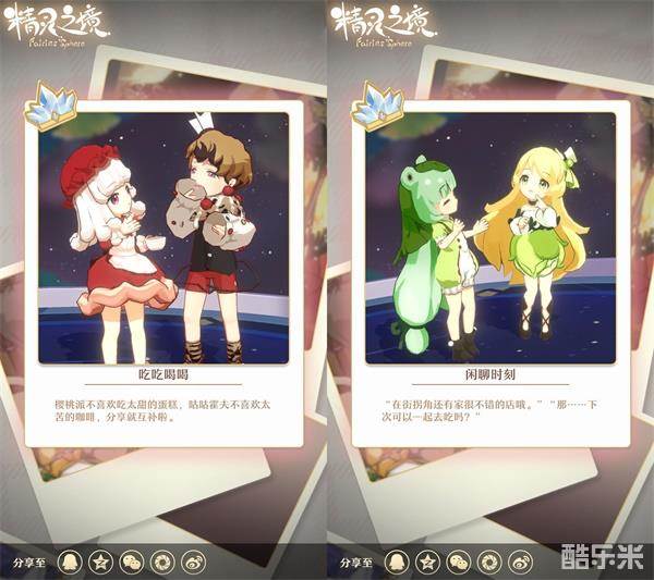 精灵之间也会进行互动,比如一个精灵在品尝美食时,另一个精灵可能会过来一同分享;当一个精灵在弹琴时,另一个精灵可能会走过来拍手合赞,也可能随着歌声翩翩起舞。