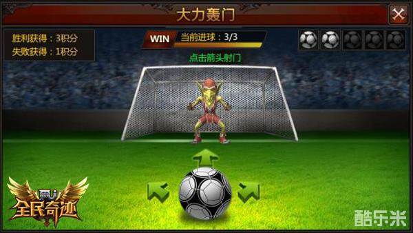若”弹无虚发“考验的是玩家眼力,”大力轰门“则是对玩家判断力的考验,只有巧妙的运用模拟方向才可以一脚定输赢。玩家通过点击“左、中、右”选择一个射门方向,NPC随机扑球,如果他没有扑中,那么你就可以获得积分奖励了。