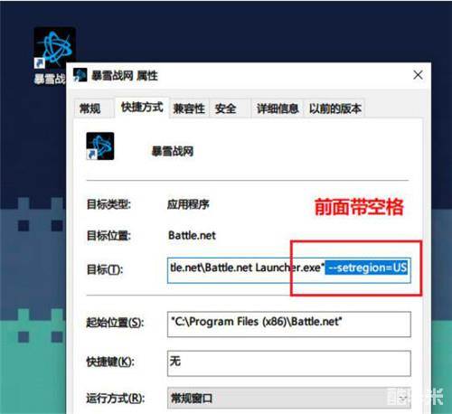 第三步:接下来下载战网客户端,右键点击图标→快捷方式→目标→在末尾添加“--setregion=US”,此时再次开启的就是国际服暴雪战网客户端了。