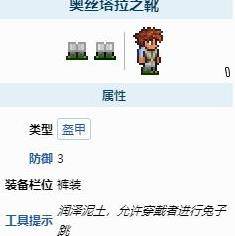 奥丝塔拉之靴属于盔甲类,防御为3,最大堆叠为1,稀有度为橙色。