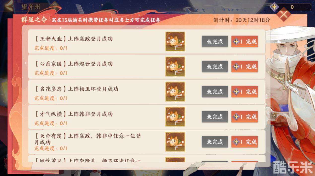 群星之令:群星之令包含【王者大业】、【心系家国】、【名花多态】等六条任务线,完成任务可获得苗灵偶、万用信物、步天绘卷碎片等珍贵奖励!完成所有任务还可获得绝版称号【群星拱北极】和绝版头像框【齐州望尽】。