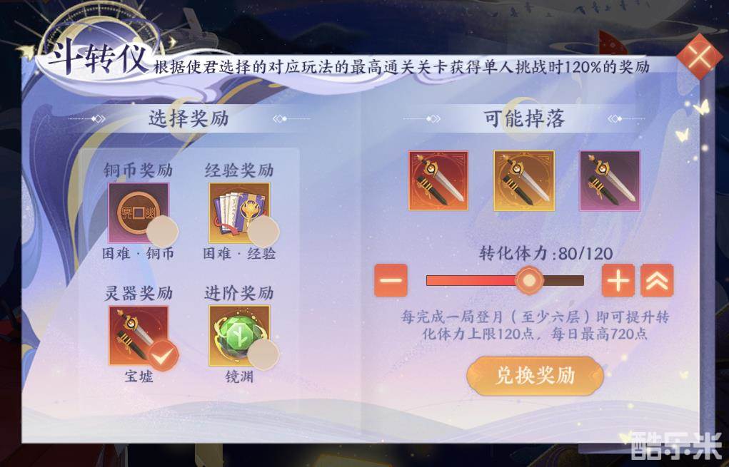 斗转仪:使君每完成一局登月且至少达到第六层后,可以将体力存入斗转仪中。可以自行选择铜币、经验、灵器、进阶材料,并将体力转化为奖励!