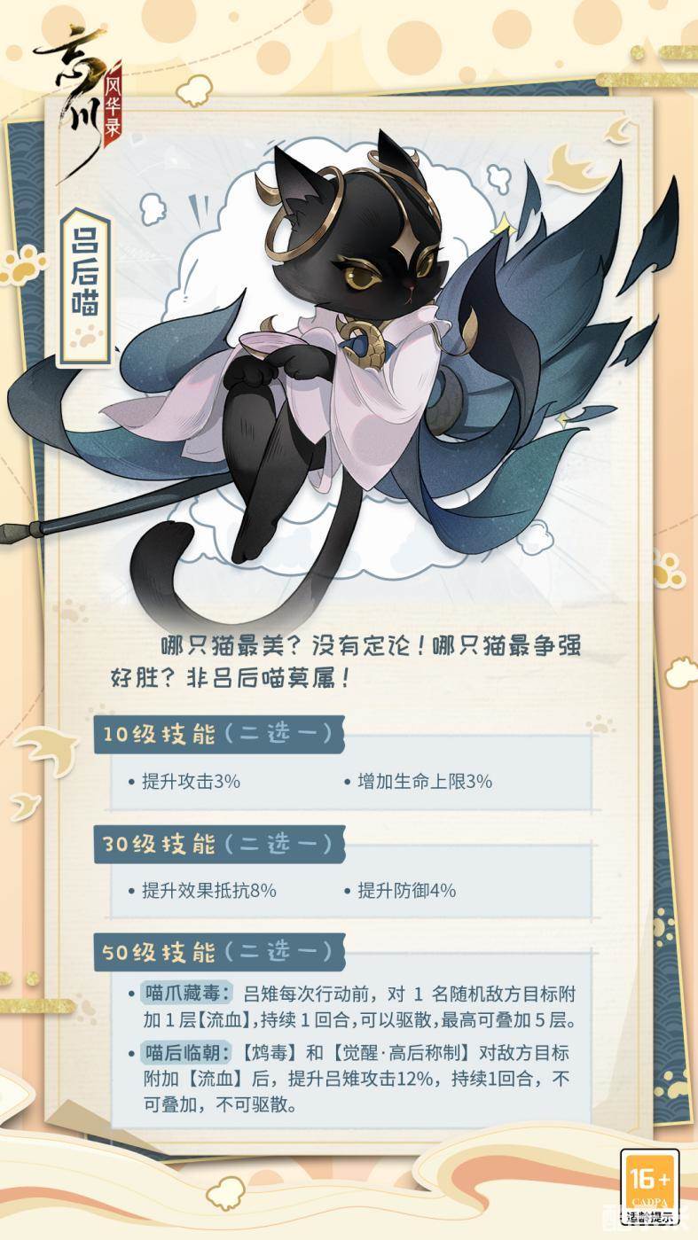 吕后喵:争强好胜的吕后喵!吕后喵等级提升至10级时,可解锁技能:提升攻击或增加生命上限;等级提升至30级时,可解锁技能:提升效果抵抗或提升防御:等级提升至50级时,即可解锁技能【喵爪藏毒】或【喵后临朝】。