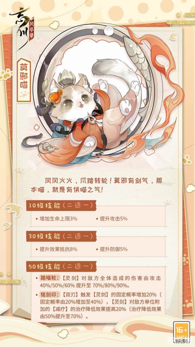 莫邪喵等级提升至10级时,可解锁技能:增加生命上限或提升攻击;等级提升至30级时,可解锁技能:提升效果抵抗或提升防御:等级提升至50级时,即可解锁技能【踏喵轮】或【铭剑印】。