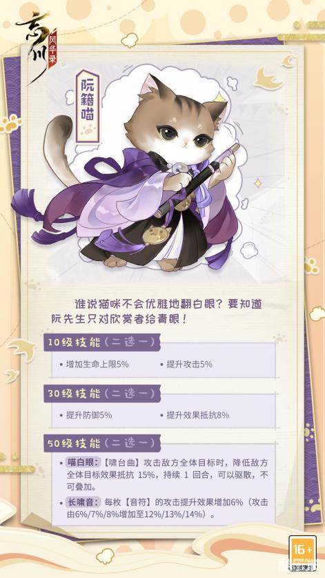 阮籍喵等级提升至10级时,可解锁技能:增加生命上限或提升攻击;等级提升至30级时,可解锁技能:提升防御或提升效果抵抗:等级提升至50级时,即可解锁技能【喵白眼】或【长啸音】。