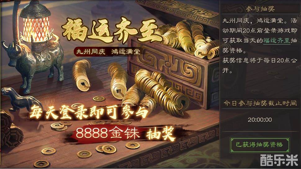 在活动期间,所有20点前登录游戏的玩家都可获得当天的福运齐至抽奖资格,抽取8888金铢大奖,获奖信息将于每日20点公开。