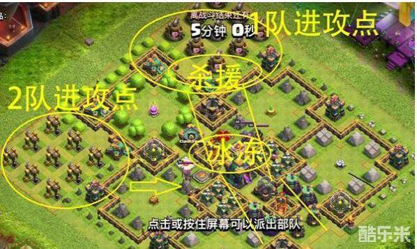4、任务主力部队蛮王+女王+大守护+5个超法+8-10个普通法师/派对法师,的主要任务是右侧两个投石,援兵,四万,大本营,地狱,2队的任务是两个投石和清边。