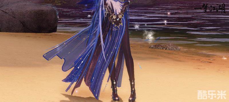 女侠身着墨色轻纱上衣,右臂覆着的蓝色羽毛在月光下熠熠生辉、流光溢彩。蓝纱裙摆轻柔垂下,交织其中的金色线条好似流星划过的轨迹,神秘奇幻,引人无限遐想。
