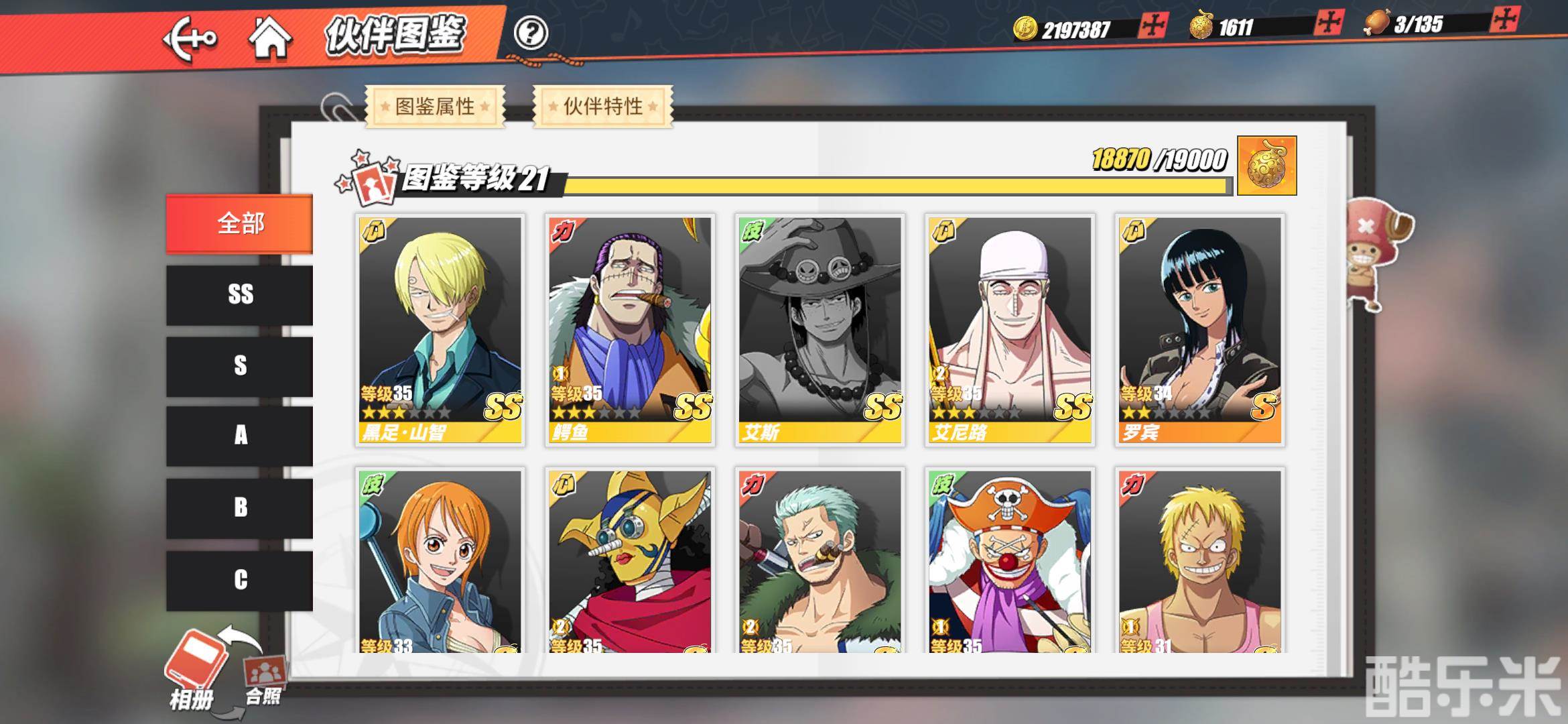 为什么说紫卡这么重要,例如紫卡桑吉,需要推图,PK,监狱,打海王。 不需要加入太多的资源。 紫卡只要升级9即可。 第二张娜美,娜美前后期所需要的。 现在几乎每个人都得到一个娜美,碎片的碎片很好获得。 前阶段一定要趁早升到金卡。 第三张的乔巴,气魄3后的斩波器真的很好用。 20%的减伤,不俗的群体回血。 非常实用。 第四张小薇,愤怒的永动机,回怒一定会要必备的紫卡。