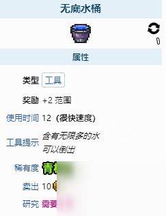 游戏中无底水桶是一种功能和标准水桶类似的物品,唯一的区别是它无需重新装水,可以无限次使用,并且其范围略大,放水的速度还比标准的水桶略快(放水时不断移动光标会更明显)。