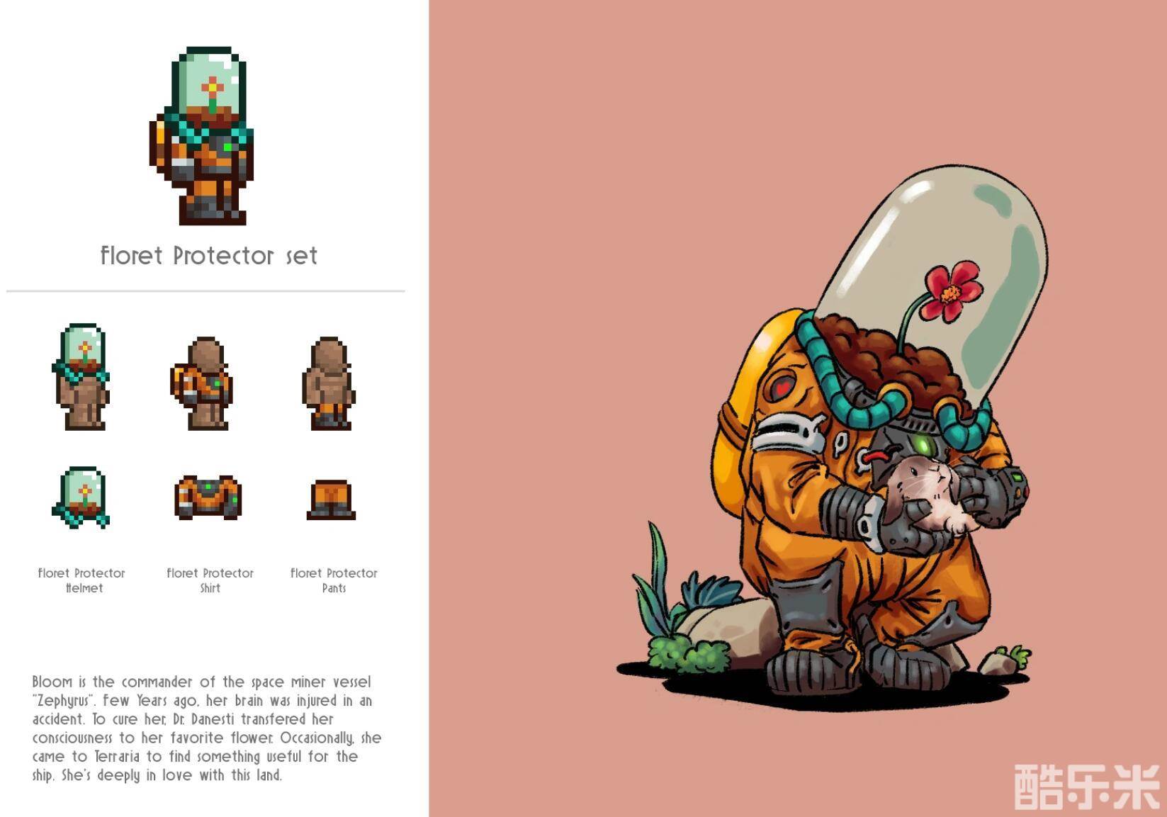由yikescloud提出概念设计,分别由护花者头盔、衬衫、裤子三部分组成,头盔是最有特色的部分,是一朵小花。